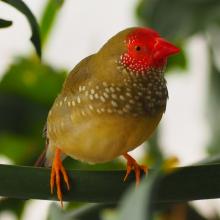 Le Diamant à queue rousse se nourrit d'une variété de graines d'herbe, de petits insectes et de fruits saisonniers. Dans son habitat naturel, le Diamant à queue rousse cherche sa nourriture au sol ou dans la végétation basse, utilisant son bec fin et pointu pour extraire les graines et les insectes des herbes et des plantes.